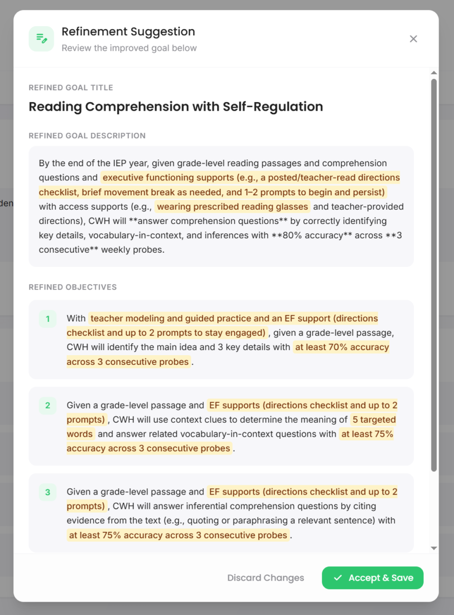 Advocate360 pulls those findings into the goals module automatically and can generate a goal draft that includes both the academic outcome and a process measure (like a problem-solving checklist), while you keep control of the wording and supports.