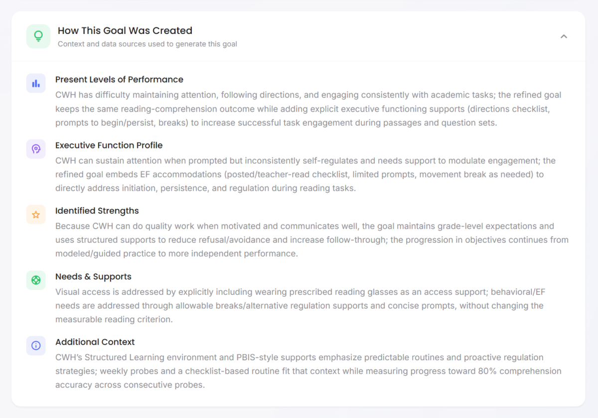 It’s a plain-language explanation of what inputs shaped the draft (example: assessment insights, present levels, strengths, needs). The point is to keep the reasoning visible, especially for team conversations.
