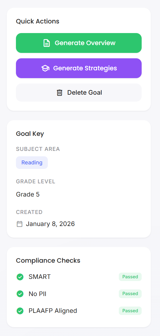 It can flag common issues (example: whether a goal reads like a SMART goal, whether it appears to include identifiers, whether standards are attached). Think of it as “spellcheck for compliance friction”, not a guarantee. AI can get things wrong so Advocate360 users are still responsible for ensuring that the final goal matches what the individual needs.